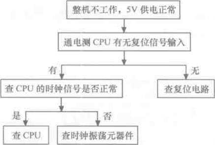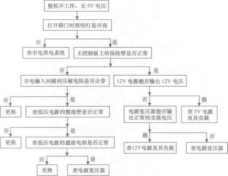 整機不工作是指插好電源線后壓縮機不運轉,顯示板上的指示燈或顯示屏也不亮,該故 障主要是由于市電供電系統或主控制板異常所致。該故障根據有無5V電壓又有所不同,沒 有5V電壓說明市電輸入系統、主控制板上的低壓電源電路異常:若5V供電正常,說明CPU 電路異常。整機不工作.5V電壓的故障檢修流程如圖8-9所示:整機不工作,有5V電壓 的故障檢修流程如圖8-10所示。